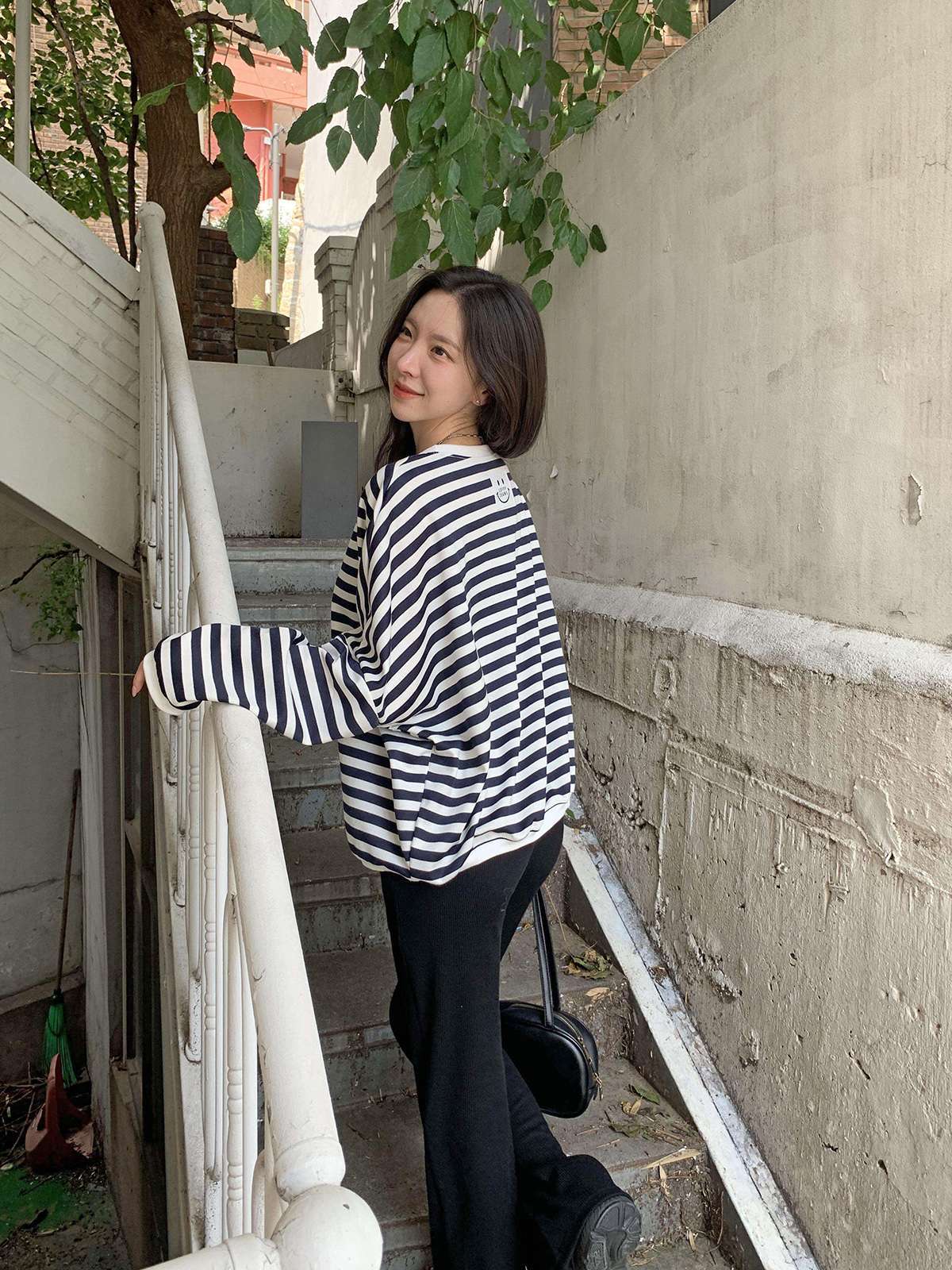 편안하면서도 귀여운 포인트를 준 스마일 패치 스트라이프 맨투맨
